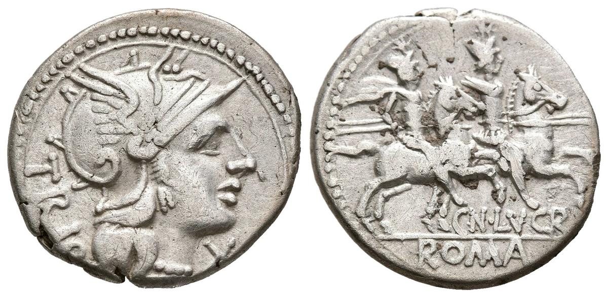 GENS LUCRETIA. Denario. (Ar. 3,81g/20mm). 136 a.C. Roma. (Crawford 237/1; FFC 822). Anv: Cabeza de Roma a derecha, delante X, detrás leyenda: ROMA. Rev: Dioscuros a caballo con estrellas encima, debajo leyenda: CN LVCR, en exergo: ROMA. MBC.