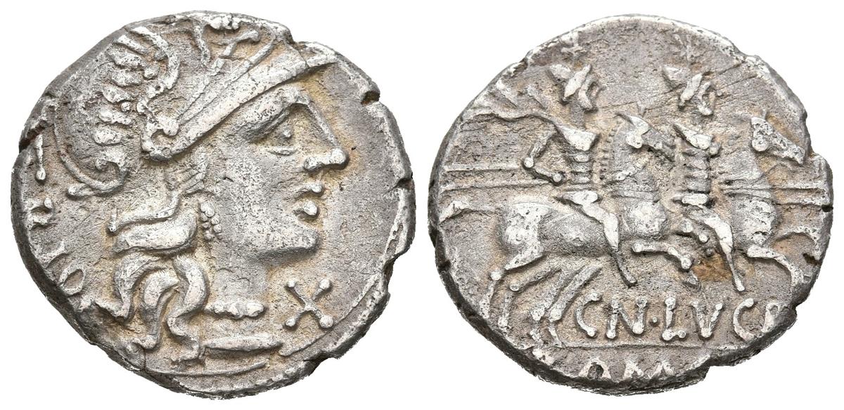 GENS LUCRETIA. Denario. (Ar. 3,71g/18mm). 136 a.C. Roma. (Crawford 237/1; FFC 822). Anv: Cabeza de Roma a derecha, delante X, detrás leyenda: ROMA. Rev: Dioscuros a caballo con estrellas encima, debajo leyenda: CN LVCR, en exergo: ROMA. MBC.