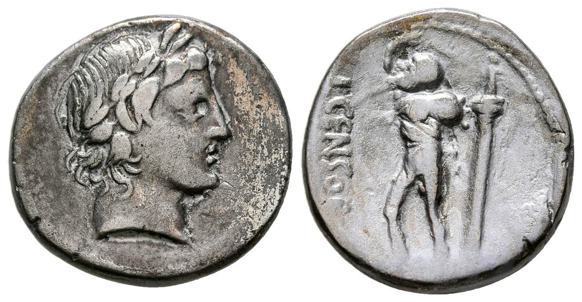 GENS MARCIA. Denario. (Ar. 3,38g/17mm). 88 a.C. Roma. (FFC 888; Crawford 363/1d). Anv: Cabeza laureada de Apolo a derecha. Rev: Sátiro Marsyas estante a izquierda, detrás columna surmontada por estatua, detrás leyenda: L CENSOR. MBC.