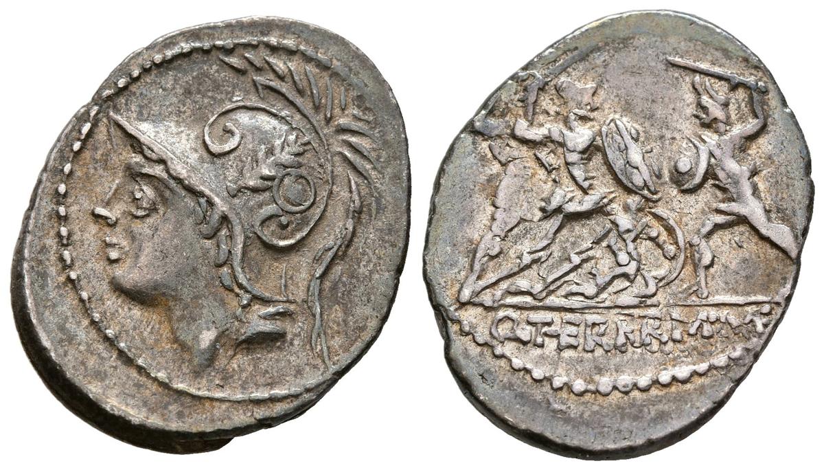 GENS MINUCIA. Denario. (Ar. 3,95g/23mm). 103 a.C. Roma (Crawford 319/1; FFC 928). Anv: Cabeza de Marte a izquierda. Rev: Dos soldados combatiendo entre ellos, otro caído en el suelo, en exergo: Q THERM MF. MBC+/MBC.