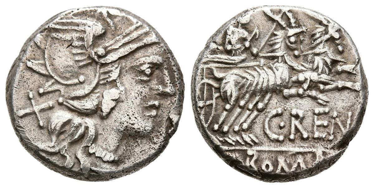 GENS RENIA. Denario. (Ar. 3,73g/16mm). 138 a.C. Roma. (FFC 1088; Crawford 231/1). Anv: Cabeza de Roma a derecha, detrás X. Rev: Juno Caprotina en biga de machos cabríos a derecha, debajo leyenda: C RENI, en exergo: ROMA. MBC.