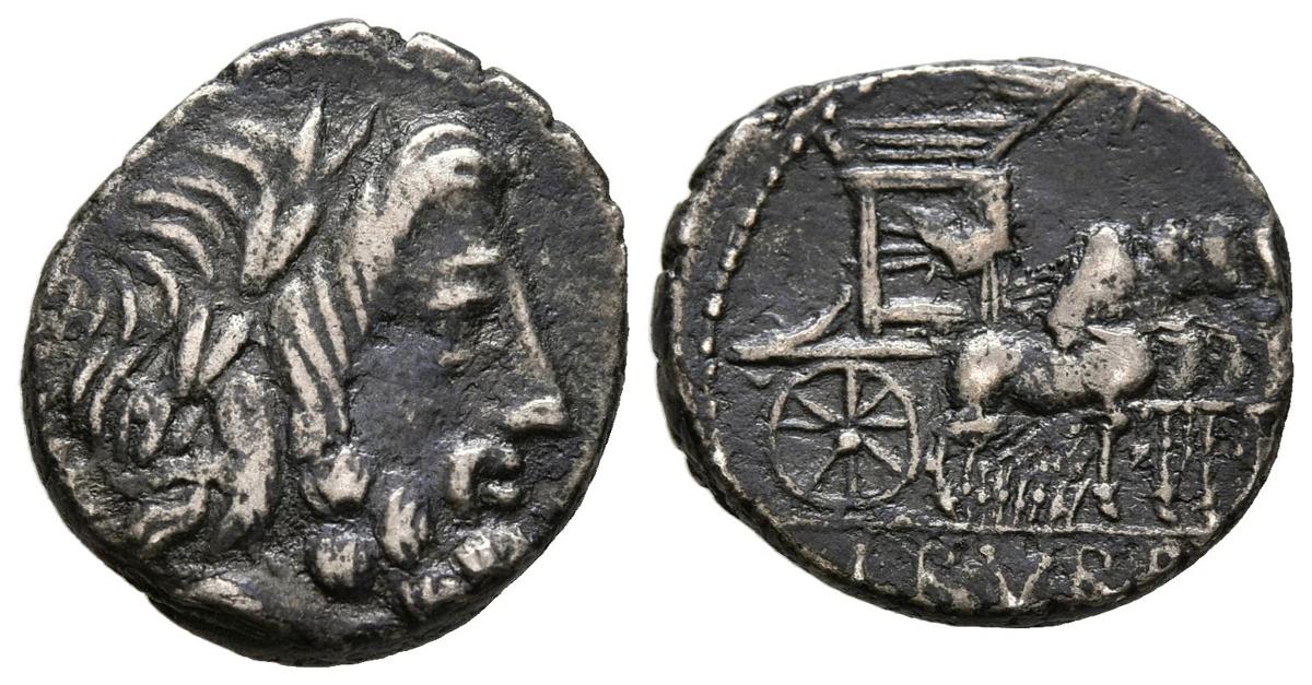 GENS RUBRIA. Denario. (Ar. 3,47g/17mm). 87 a.C. Roma. (FFC 1091; Crawford 348/1). Anv: Cabeza laureada de Júpiter a derecha, con cetro sobre hombro, detrás DOSSEN. Rev: Carro triunfal a derecha encima Victoria volando con una corona, en exergo: L RVBRI. MBC.