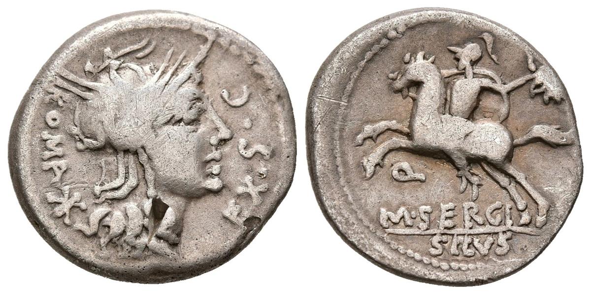 GENS SERGIA. Denario. (Ar. 3,75g/18mm). 116-115 a.C. Norte de Italia. (FFC 1111; Crawford 286/1). Anv: Cabeza de Roma a derecha, detrás estrella, detrás: ROMA, delante: EX SC. Rev: Jinete con espada a izquierda en el campo cabeza de galo, debajo leyenda: Q M SERGI, en exergo: SILVS. MBC-. Incisión en anverso.