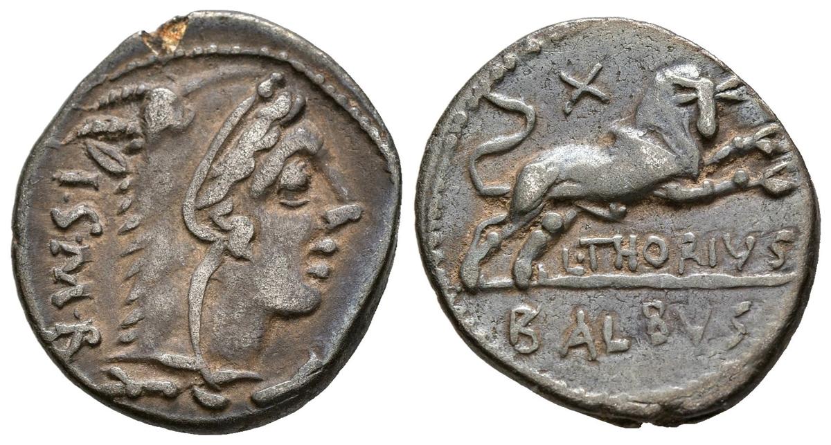 GENS THORIA. Denario. (Ar. 3,83/20mm). 105 a.C. Norte de Italia. (FFC 1141; Crawford 316/1). Anv: Cabeza de Juno Sospita con piel de cabra a derecha, detrás leyenda: ISMR. Rev: Toro a derecha, encima letra: R, debajo leyenda: L THORIVS, en exergo: BALBVS. MBC.