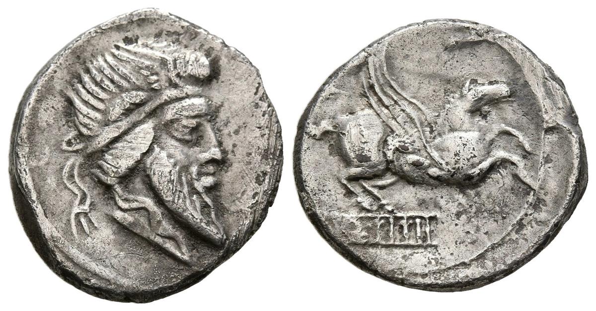 GENS TITIA. Denario. (Ar. 3,63g/18mm). 90 a.C. Italia central. (Crawford 341/1; FFC 1142). Anv: Cabeza del dios Mutinus Titinus a derecha. Rev: Pegaso a derecha, debajo leyenda: Q TITI. MBC.
