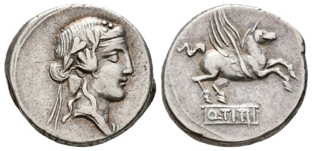 GENS TITIA. Denario. (Ar. 2,95g/18mm). 90 a.C. Italia central. (Crawford 341/2; FFC 1143). Anv: Cabeza de Baco joven a derecha. Rev: Pegaso a derecha, debajo leyenda: Q TITI. MBC+.