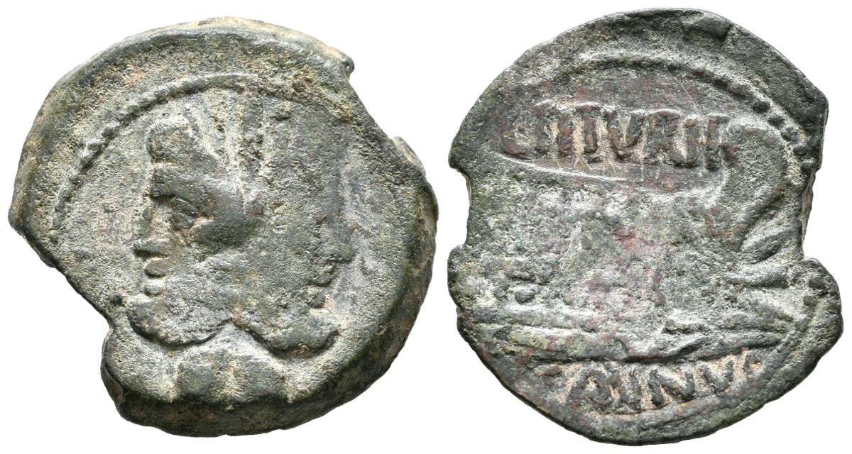 GENS TITURIA. As. (Ae. 9,37g/27mm). 89 a.C. Roma. (Crawford 344/4b). Anv: Cabeza bifronte laureada de Jano, encima: I. Rev: Proa a derecha, encima leyenda: L TITVRI LF, debajo: SABINVS, delante I. MBC. Cospel faltado. Escaso.