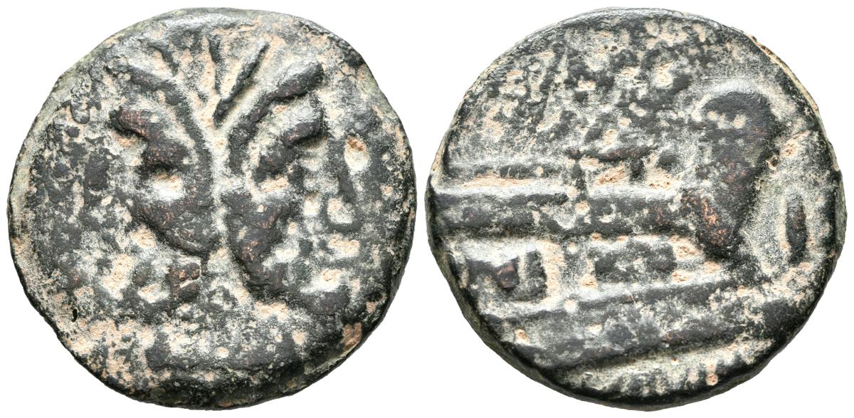 POMPEYO, el Grande. As. (Ae. 15,44g/29mm). 46-45 a.C. Córdoba. (Crawford 471/1). Anv: Cabeza bifronte laureada de Jano, encima: I. Rev: Proa a derecha, encima: CN MAG, delante: I, debajo: IMP. MBC-.
