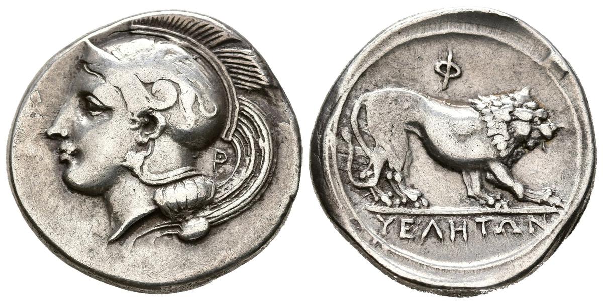 LUCANIA, Velia. Estátera. (Ar. 7,46g/24mm). 340-334 a.C. (HN Italy 1284; HGC 1, 1310). Anv: Cabeza de Atenas con casco a izquierda, detrás letra P. Rev: León a derecha, encima letra griega, debajo leyenda griega. MBC+.