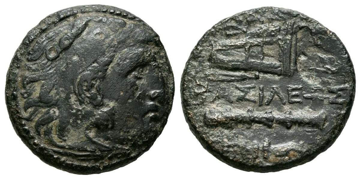 REYES DE MACEDONIA, Alejandro III el Grande. Ae20. (Ae. 5,76g/20mm). 336-323 a.C. (Price 284). Anv: Cabeza de Heracles con piel de león a derecha. Rev: Arco con carcaj, debajo mazo y rayo, entre ellos leyenda griega. MBC.