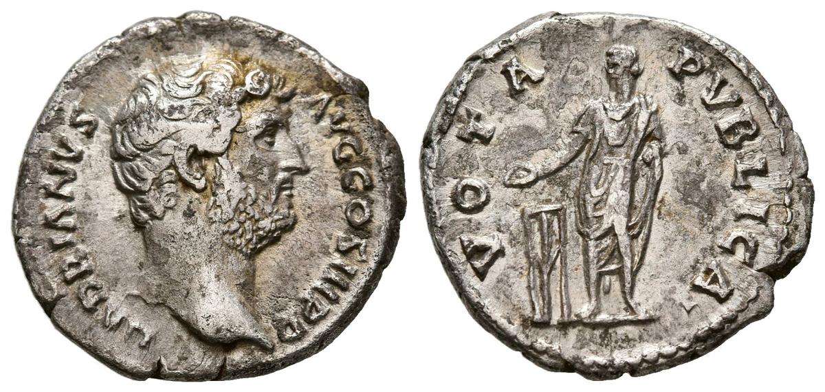 ADRIANO. Denario. (Ar. 3,12g/18mm). 137 d.C. Roma. (RIC 290). Anv: Cabeza de Adriano a derecha, alrededor leyenda: HADRIANVS AVG COS III P P. Rev: Adriano velado estante a izquierda con patera sobre trípode, alrededor leyenda: VOTA PVBLICA. MBC+.