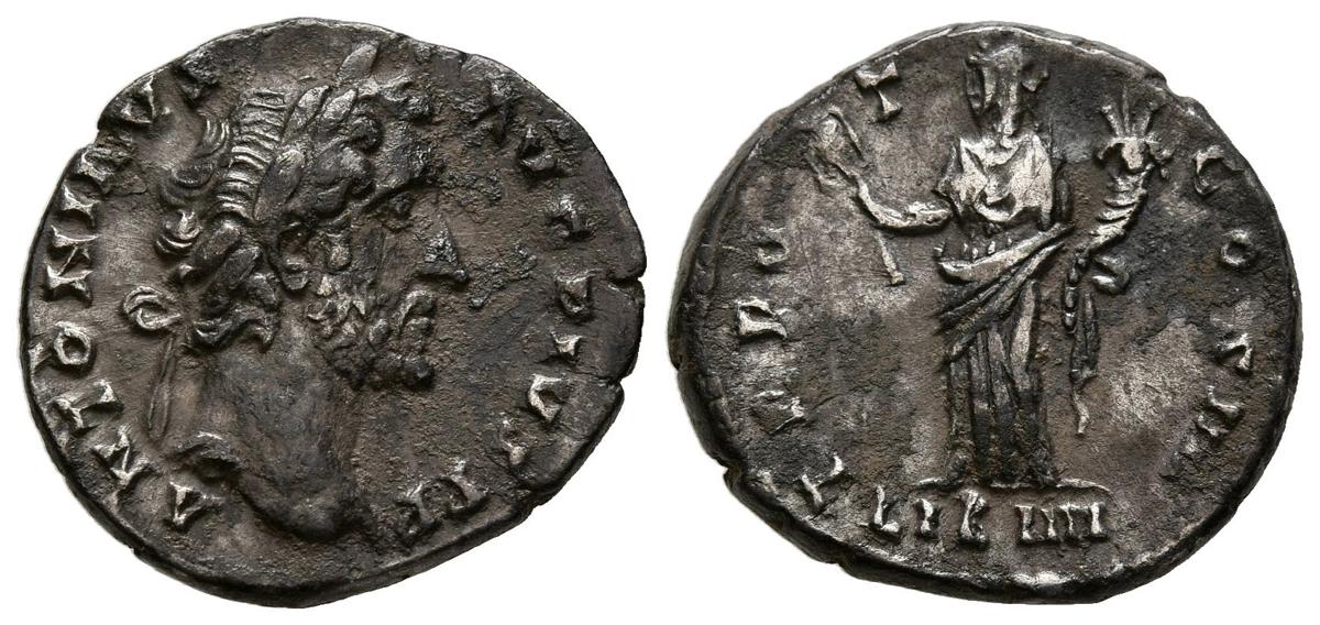 ANTONINO PIO. Denario. (Ar. 3,31g/18mm). 145-161 d.C. Roma. (RIC 156). Anv: Cabeza laureada de Antonino Pío a derecha, alrededor leyenda: ANTONINVS AVG PIVS P P. Rev: Liberalitas estante a izquierda portando ábaco y cornucopia, en exergo: LIB IIII, alrededor leyenda: TR POT COS IIII. MBC.