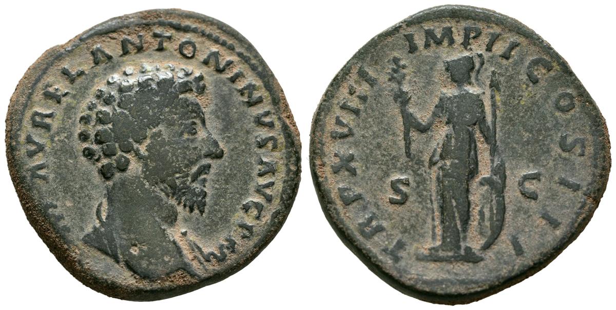 MARCO AURELIO. Sestercio. (Ae. 27,00g/33mm). 163-164 d.C. Roma. (RIC 871var). Anv: Cabeza de Marco Aurelio a derecha, alrededor leyenda: M AVREL ANTONINVS AVG P M. Rev: Minerva estante a izquierda portando rama, lanza y escudo, entre S-C, alrededor leyenda: TR P XVIII IMP II COS III. MBC. Escaso ejemplar.