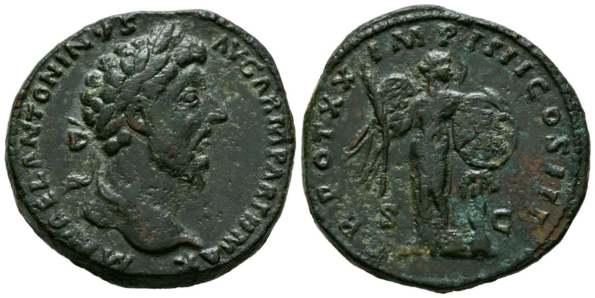 MARCO AURELIO. Sestercio. (Ae. 23,37g/32mm). 166 d.C. Roma. (RIC 931). Anv: Cabeza laureada de Marco Aurelio a derecha, alrededor leyenda: M AVREL ANTONINVS AVG ARM PARTH MAX. Rev: Victoria estante a derecha portando palma y con el brazo sobre escudo con inscripción: VIC PAR, entre S-C, alrededor leyenda: TR POT XX IMP IIII COS III. MBC. Campos repasados.