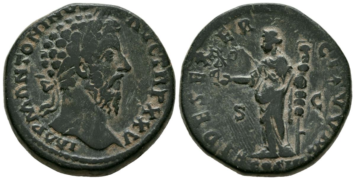 MARCO AURELIO. Sestercio. (Ae. 23,10g/30mm). 171 d.C. Roma. (RIC 998). Anv: Cabeza laureada de Marco Aurelio a derecha, alrededor leyenda: IMP ANTONINVS AVG TR P XXV. Rev: Fides estante a izquierda portando estandarte y Victoria con corona de laurel sobre globo, entre S-C, alrededor leyenda: FIDES EXERCITVM. MBC.