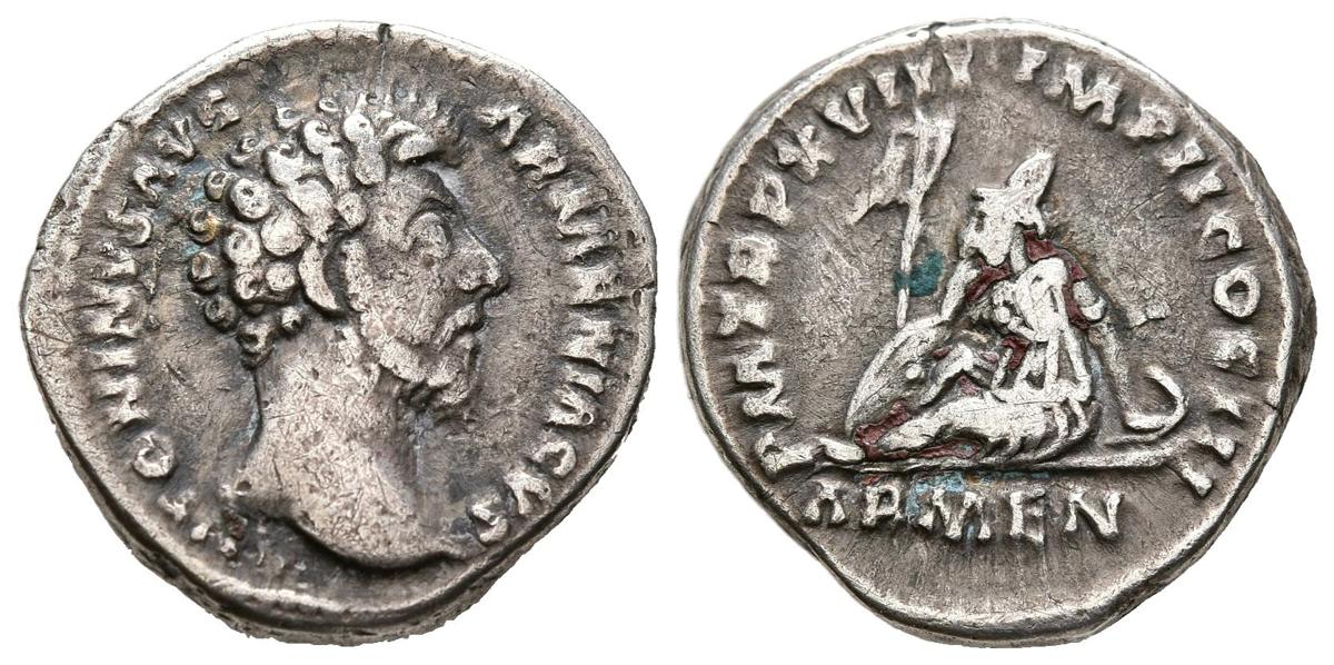 MARCO AURELIO. Denario. (Ar. 2,64g/17mm). 163-164 d.C. Roma. (RIC 80). Anv: Cabeza de Marco Aurelio a derecha, alrededor leyenda: ANTONINVS AVG ARMENIACVS. Rev: Armenia tumbada a izquierda, detrás escudo y estandarte, en exergo: ARMEN, alrededor leyenda: P M TR P XVIII IMP II COS III. MBC.