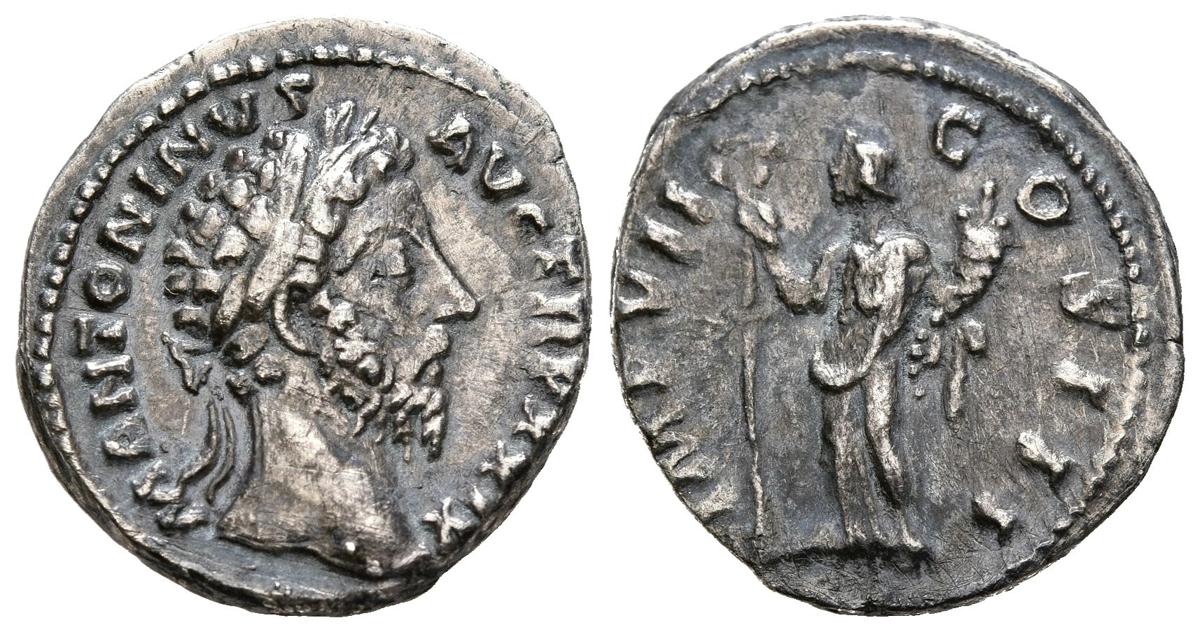 MARCO AURELIO. Denario. (Ar. 3,24g/19mm). 174-175 d.C. Roma. (RIC 314). Anv: Cabeza laureada de Marco Aurelio a derecha, alrededor leyenda: M ANTONINVS AVG TR P XXIX. Rev: Felicitas estante a izquierda portando caduceo y cornucopia, alrededor leyenda: IMP VII COS III. MBC.