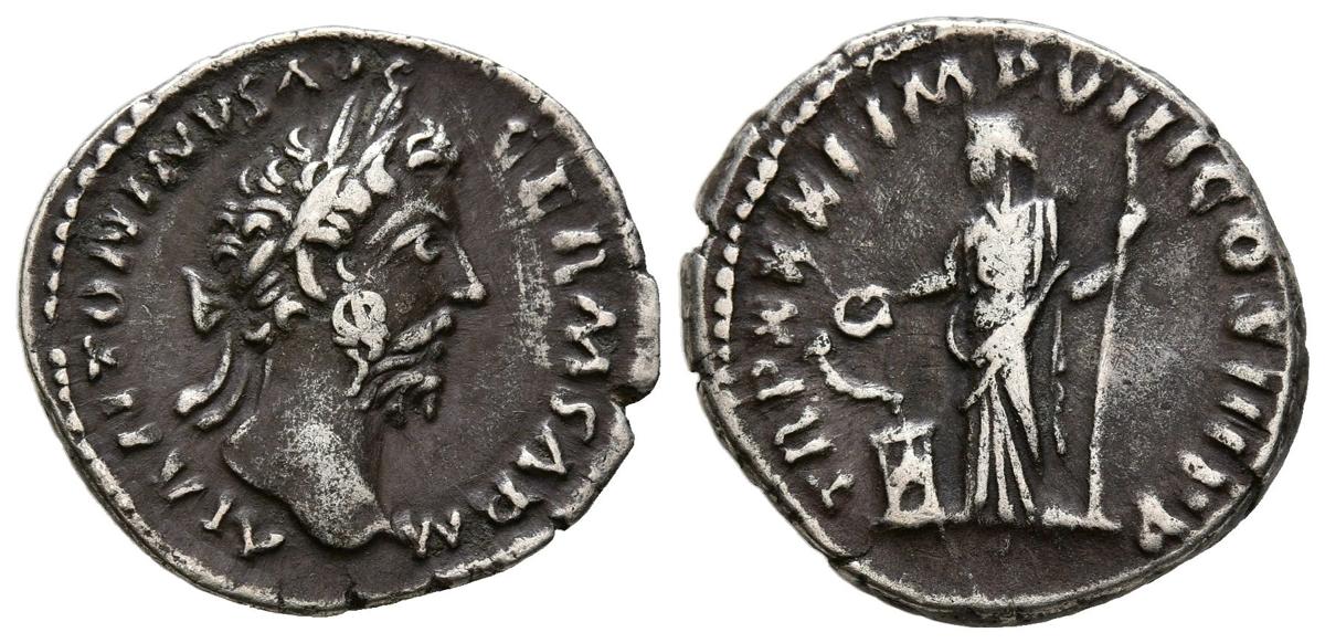 MARCO AURELIO. Denario. (Ar. 3,37g/19mm). 176-177 d.C. Roma. (RIC 373). Anv: Cabeza laureada de Marco Aurelio a derecha, alrededor leyenda: ANTONINVS AVG GERM SARM. Rev: Salus estante a izquierda portando cetro y alimentando a serpiente de patera, alrededor leyenda: TR P XXXI IMP VIII COS III P P. MBC.