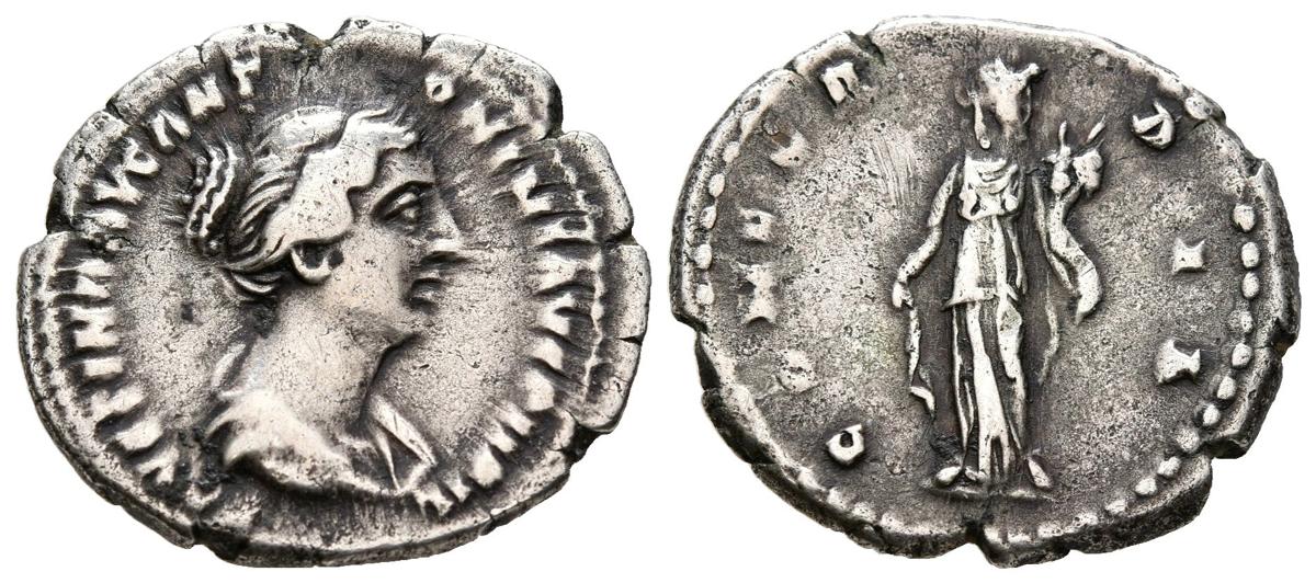 FAUSTINA II. Denario. (Ar. 3,55g/20mm). 149-152 d.C. Roma. (RIC 500b). Anv: Busto drapeado de Faustina II a derecha, alrededor leyenda: FAVSTINA AVG ANTONINI AVG PII FIL. Rev: Concordia estante a derecha portando cornucopia, alrededor leyenda: CONCORDIA. MBC-.