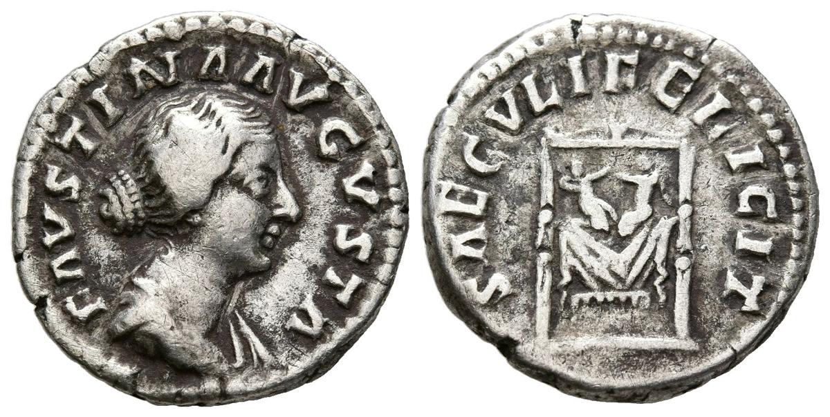 FAUSTINA II. Denario. (Ar. 3,26g/18mm). 161-176 d.C. Roma. (RIC 712). Anv: Busto drapeado de Faustina II a derecha, alrededor leyenda: FAVSTINA AVGVSTA. Rev: Pulvinar con Cómodo y Antonino sobre él, alrededor leyenda: SAECVLI FELICIT. MBC.