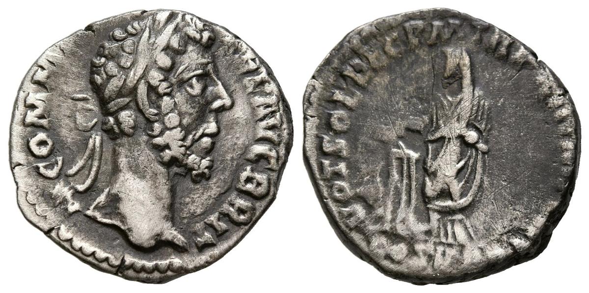 COMODO. Denario. (Ar. 3,03g/18mm). 186-187 d.C. Roma. (RIC 140). Anv: Cabeza laureada de Cómodo a derecha, alrededor leyenda: M COMM ANT P FEL AVG BRIT. Rev: Cómodo estante a izquierda con patera sobre trípode , detrás cautivo, en exergo: COS V P P, alrededor leyenda: VOT SOL DEC P M TR P XI IMP VIII. MBC.