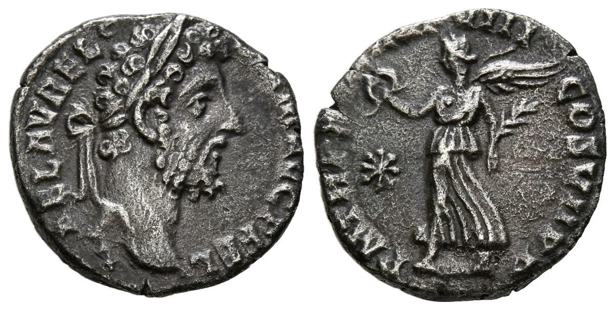 COMODO. Denario. (Ar. 2,36g/17mm). 192 d.C. Roma. (RIC 237). Anv: Cabeza laureada de Cómodo a derecha, alrededor leyenda: L AEL AVREL COMM AVG P FEL. Rev: Victoria portando palma y corona de laurel avanzando a izquierda, delante estrella, alrededor leyenda: P M TR P XVII IMP VIII COS VII P P. MBC.