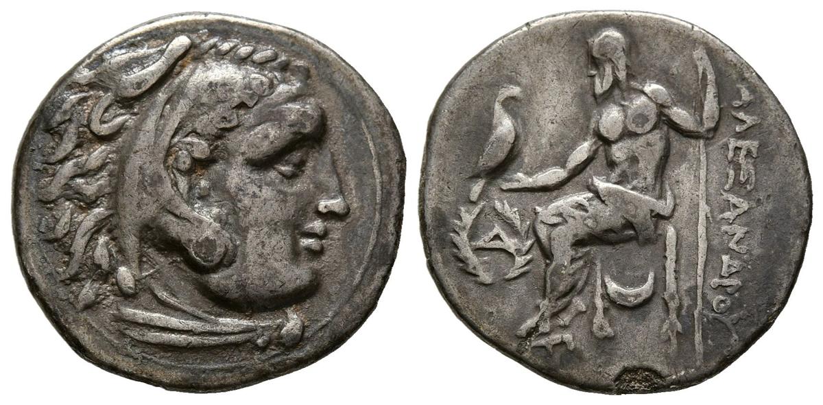 REYES DE MACEDONIA, Alejandro III el Grande. Dracma. (Ar. 3,81g/19mm). 310-305 a.C. Magnesia. (Price 1982). Anv: Cabeza de Heracles con piel de león a derecha. Rev: Zeus sentando a izquierda portando cetro y águila, delante A dentro de corona de laurel y creciente bajo trono, detrás leyenda griega. MBC.