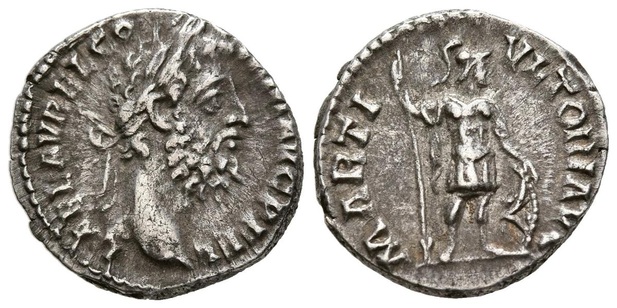 COMODO. Denario. (Ar. 3,19g/17mm). 191-192 d.C. Roma. (RIC 257). Anv: Cabeza laureada de Cómodo a derecha, alrededor leyenda: L AEL AVREL COMM AVG P FEL. Rev: Marte estante a derecha portando lanza y escudo, alrededor leyenda: MARTI VLTORI AVG. MBC+.