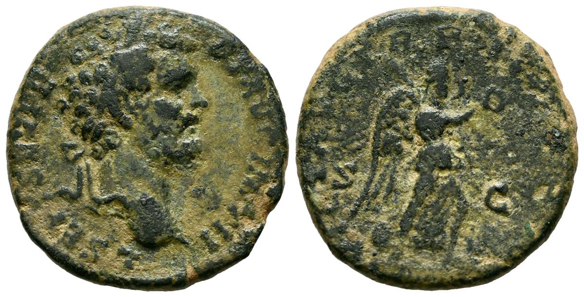 SEPTIMIO SEVERO. As. (Ae. 8,75g/23mm). 193-211 d.C. Roma. (RIC 665). Anv. Cabeza laureada de Septimio Severo a derecha, alrededor leyenda: IMP CAE L SEP SEV PERT AVG. Rev: Victoria avanzando a derecha con corona de laurel, entre S-C, alrededor leyenda: P M TR P II COS II. MBC-.