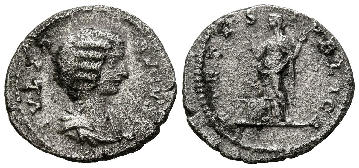 JULIA DOMNA. Denario. (Ar. 2,99g/19mm). 200-207 d.C. Roma. (RIC 574). Anv: Busto diademado y drapeado de Julia Domna a derecha, alrededor leyenda: IVLIA AVGVSTA. Rev: Pietas estante a izquierda portando patera sobre altar y alzando mano izquierda, alrededor leyenda: PIETAS PVBLICA. MBC-. Oxidaciones limpiadas.