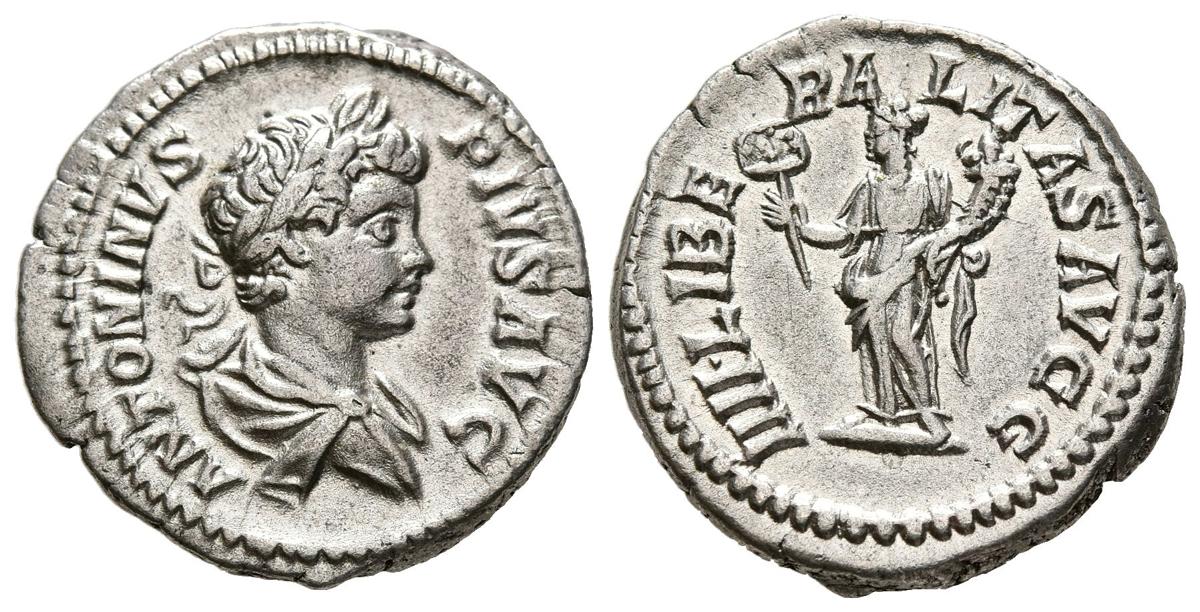 CARACALLA. Denario. (Ar. 3,67g/19mm). 201-206 d.C. Roma. (RIC 135). Anv: Busto laureado y drapeado de Caracalla a derecha, alrededor leyenda: ANTONINVS PIVS AVG. Rev: Liberalitas estante a izquierda portando ábaco y cornucopia, alrededor leyenda: LIBERALITAS AVGG. MBC+. Bonito ejemplar.