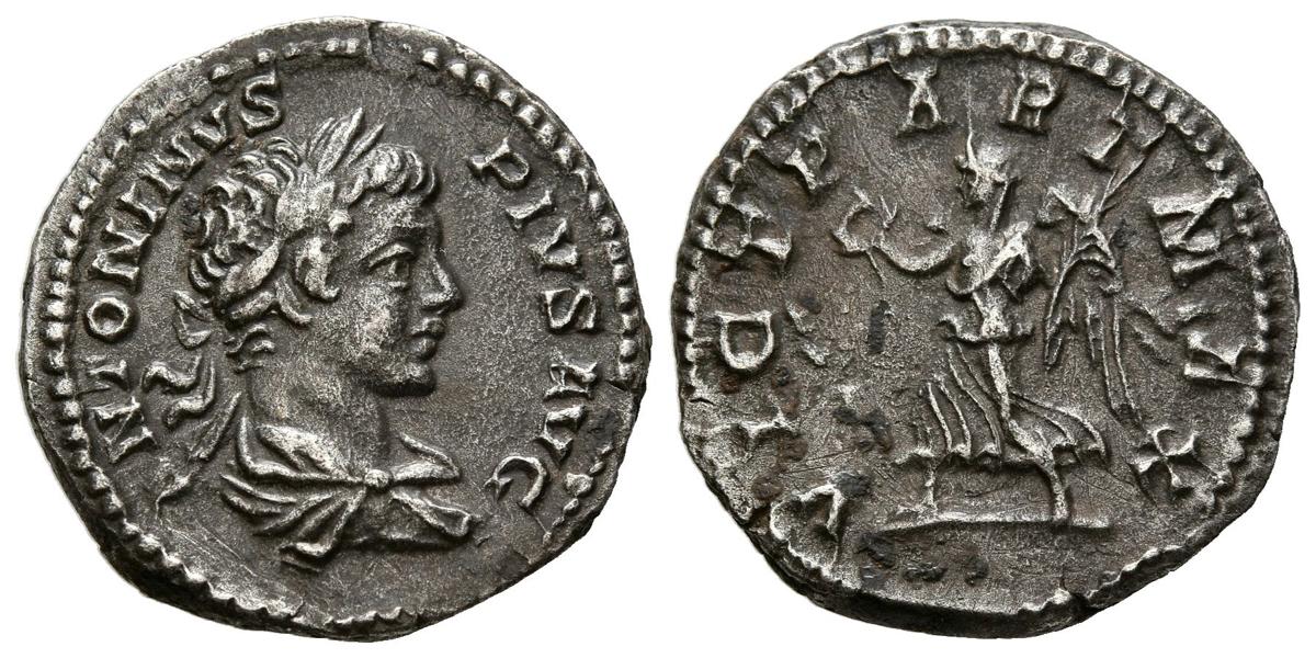 CARACALLA. Denario. (Ar. 3,24g/19mm). 201-206 d.C. Roma. (RIC 144b). Anv: Busto laureado y drapeado de Caracalla a derecha, alrededor leyenda: ANTONINVS PIVS AVG. Rev: Victoria avanzando a izquierda portando corona de laurel y palma, alrededor leyenda: VICT PART MAX. MBC+.