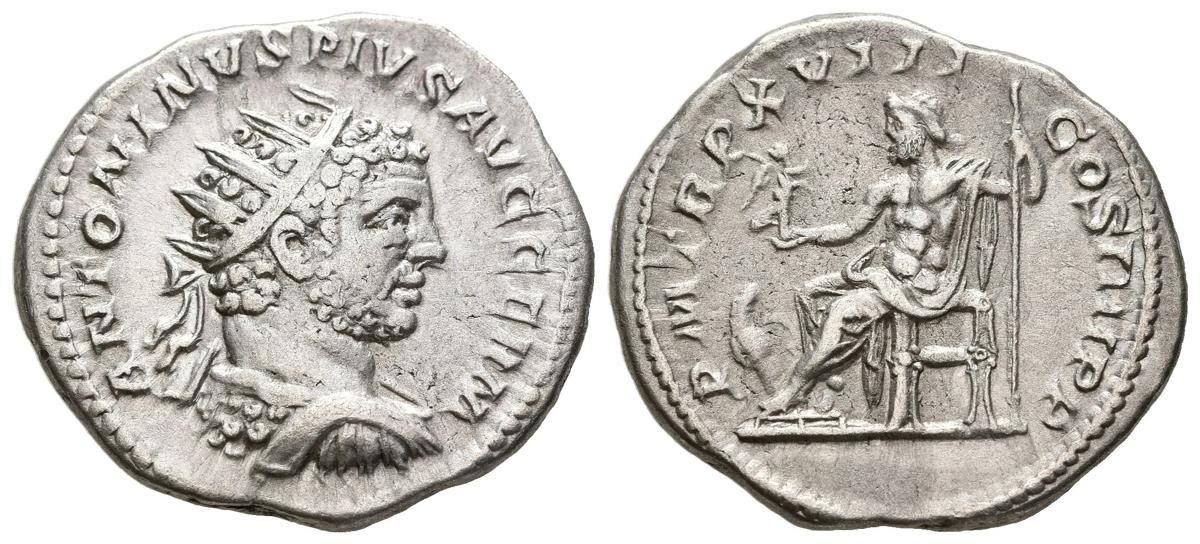 CARACALLA. Antoniniano. (Ar. 5,29g/23mm). 216 d.C. Roma. (RIC 277b). Anv: Busto radiado y con coraza de Caracalla a derecha, alrededor leyenda: ANTONINVS PIVS AVG GERM. Rev: Júpiter sentado a izquierda portando Victoria con corona de laurel y cetro, a sus pies águila a derecha, alrededor leyenda: P M TR P XVIIII COS IIII P P. MBC+.