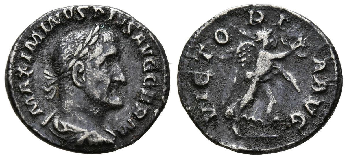 MAXIMINO I. Denario. (Ar. 2,74g/19mm). 236 d.C. Roma. (RIC 16). Anv: Busto laureado y drapeado de Maximino I a derecha, alrededor leyenda: MAXIMINVS PIVS AVG GERM. Rev: Victoria avanzando a derecha portando corona de laurel, alrededor leyenda: VICTORIA AVG. MBC.