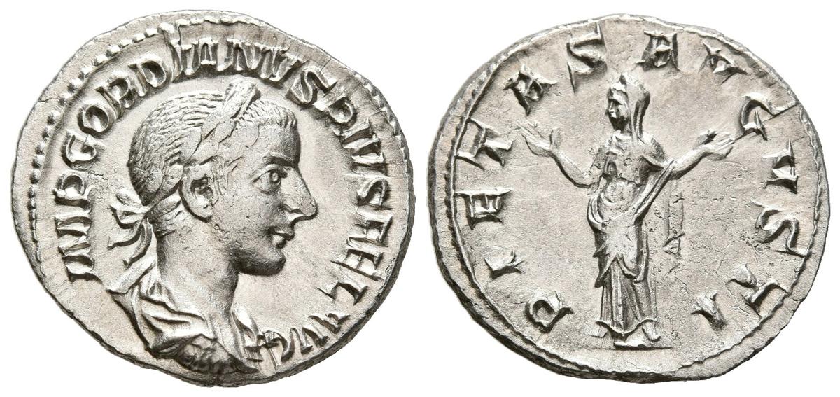 GORDIANO III. Denario. (Ar. 3,02g/20mm). 241 d.C. Roma. (RIC 129). Anv: Busto laureado y drapeado de Gordiano III a derecha, alrededor leyenda: IMP GORDIANVS PIVS FEL AVG. Rev: Pietas estante a izquierda alzando ambas manos, alrededor leyenda: PIETAS AVGVSTI. EBC-. Restos de brillo original. Bonito ejemplar.