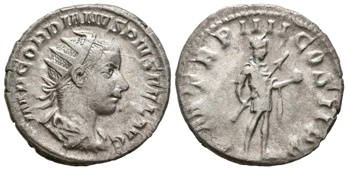GORDIANO III. Antoniniano. (Ar. 3,87g/21mm). 241-243 d.C. Roma. (RIC 9). Anv: Busto drapeado y radiado de Gordiano III a derecha, alrededor leyenda: IMP GORDIANVS PIVS FEL AVG. Rev: Gordiano III estante a derecha con atuendo militar portando lanza y globo, alrededor leyenda: P M TR P IIII COS II P P. MBC.