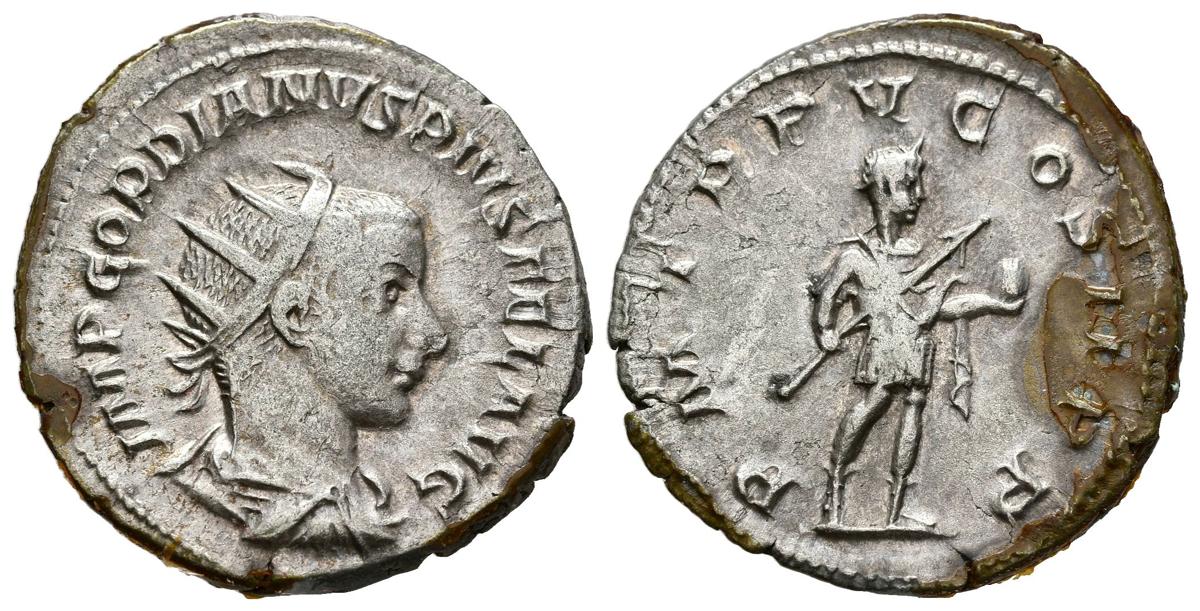 GORDIANO III. Antoniniano. (Ar. 4,24g/22mm). 241-243 d.C. Roma. (RIC 93). Anv: Busto radiado y drapeado de Gordiano III a derecha, alrededor leyenda: IMP GORDIANVS PIVS FEL AVG. Rev: Gordiano III a derecha portando lanza y globo, alrededor leyenda: P M TR P V COS II P P. MBC.