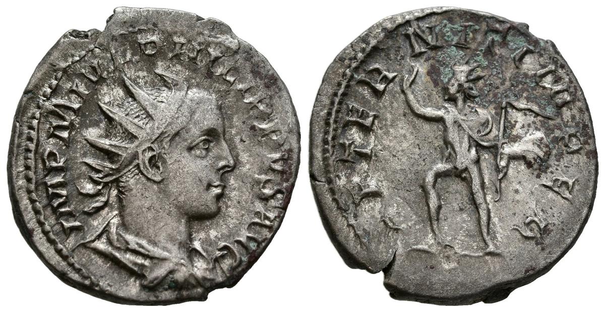 FILIPO II. Antoniniano. (Ar. 4,34g/23mm). 247 d.C. Roma. (RIC 226). Anv: Busto radiado y drapeado de Filipo II a derecha, alrededor leyenda: IMP M IVL PHILIPPVS AVG. Rev: Aeternitas avanzando a izquierda portando látigo, alrededor leyenda: ATERNIT IMPER. MBC.
