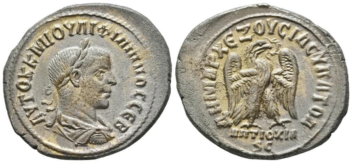 FILIPO II. Tetradracma. (Ar. 11,50g/30mm). 247-249 d.C. Seleucis y Pierria. (McAlee 1042). Anv: Busto laureado, drapeado y con coraza de Filipo II a derecha, alrededor leyena griega. Rev: Aguila estante a derecha con corona de laurel en el pico, debajo leyenda: ANTIOXIA/SC, alrededor leyenda griega. EBC+. Precioso ejemplar.