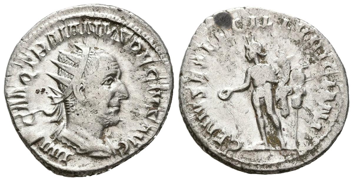 TRAJANO DECIO. Antoniniano. (Ar. 4,34g/23mm). 249-251 d.C. Roma. (RIC 16c). Anv: Busto radiado y drapeado de Trajano Decio a derecha, alrededor leyenda: IMP C M Q TRAIANVS DECIVS AVG. Rev: Genio estante a izquierda portando patera y cornucopia, detrás estandarte, alrededor leyenda: GENIVS EXERC ILLVRICIANI. MBC/MBC-.