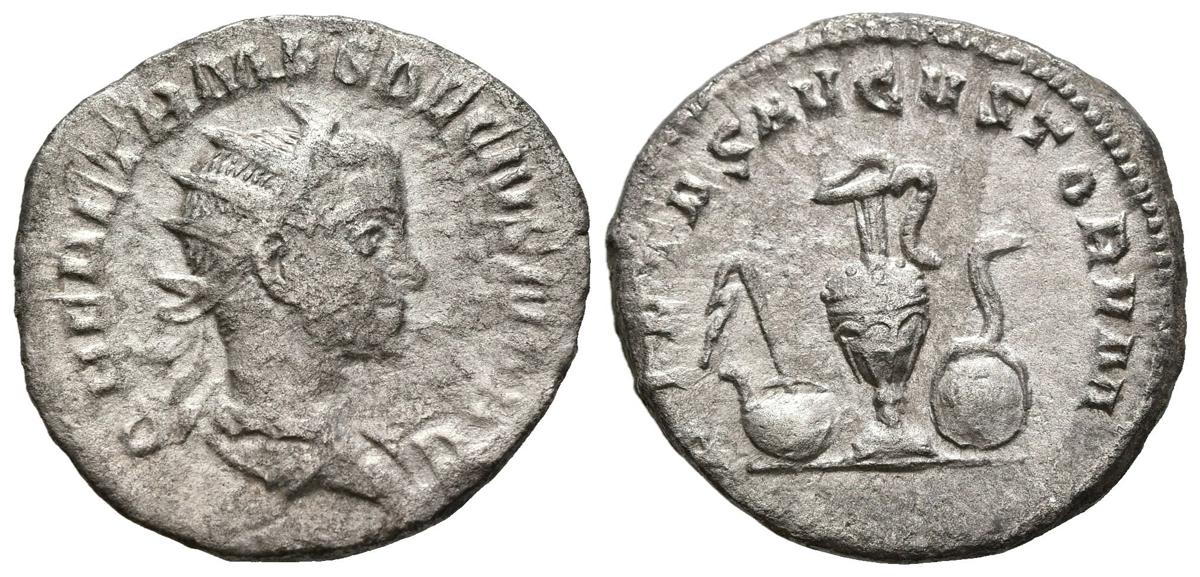 HERENIO ETRUSCO. Antoniniano. (Ar. 3,75g/22mm). 250 d.C. Roma. (RIC 143). Anv: Busto radiado, drapeado y con coraza de Herenio Etrusco a derecha, alrededor leyenda: Q HER ETR MES DECIVS NOB C. Rev: Elementos religiosos: símpulo, cetro, jarra y aspérgilo, alrededor leyenda: PIETAS AVGVSTORVM. MBC/MBC+. Escaso.
