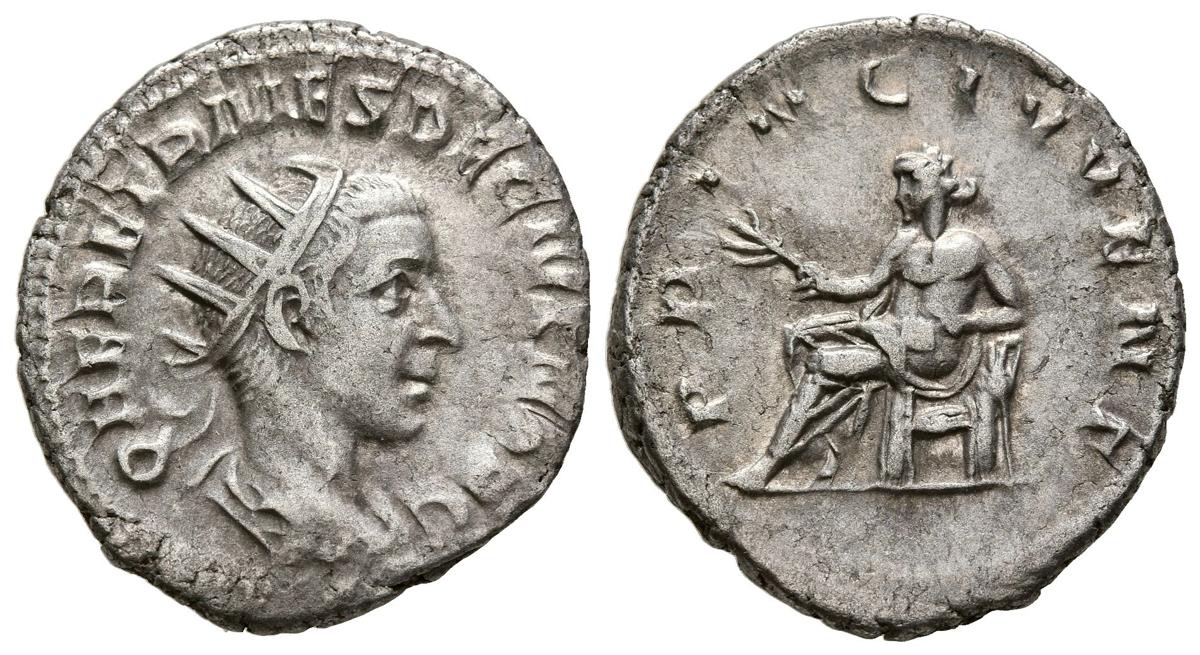 HERENIO ETRUSCO. Antoniniano. (Ar. 3,80g/22mm). 250-251 d.C. Roma. (RIC 144b). Anv: Busto radiado y drapeado de Herenio Etrusco a derecha, alrededor leyenda: Q HER ETR MES DECIVS NOB C. Rev: Apollo sentado a izquierda portando rama, alrededor leyenda: PRINC IVVENT. MBC+.
