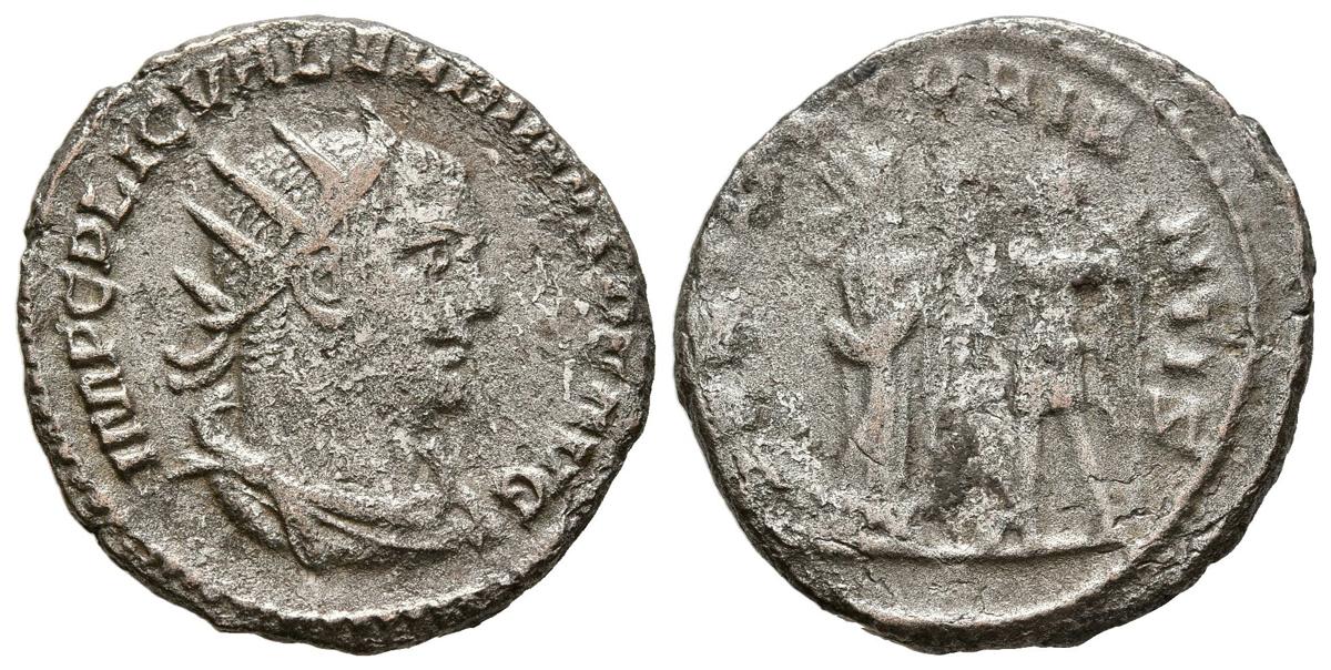 VALERIANO I. Antoniniano. (Ve. 3,90g/21mm). 255-256 d.c. Samosata. (RIC 287). Anv: Busto radiado y drapeado de Valeriano I a derecha, alrededor leyenda: IMP C P LIC VALERIANVS P F AVG. Rev: Figura femenina con corona mural coronando a Valeriano I estante a izquierda portando cetro, alrededor leyenda: RESTITVT ORIENTIS. MBC-.