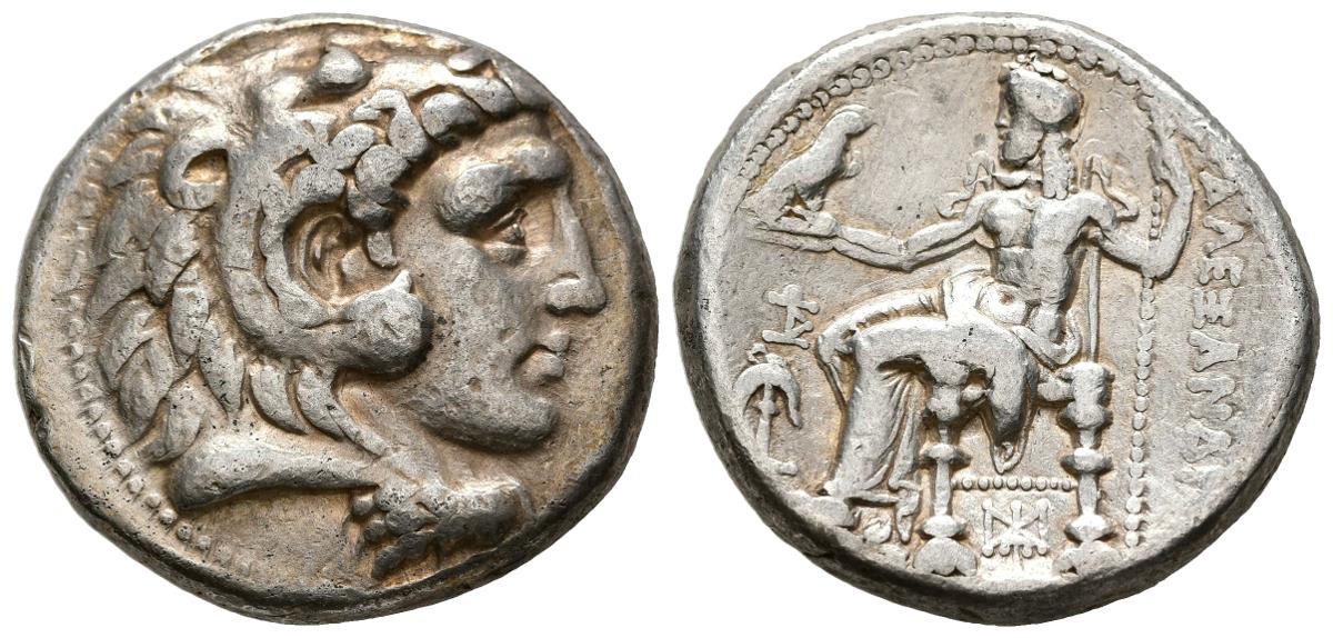 REYES DE MACEDONIA, Seleukos I Nikator. Tetradracma. (Ar. 16,97g/25mm). 312-281 a.C. Ekbatana. (Price 3945). Anv: Cabeza de Heracles a derecha con piel de león. Rev: Zeus sentado a izquierda portando cetro y águila, delante monograma y ancla, debajo del trono monograma, detrás leyenda griega. MBC.