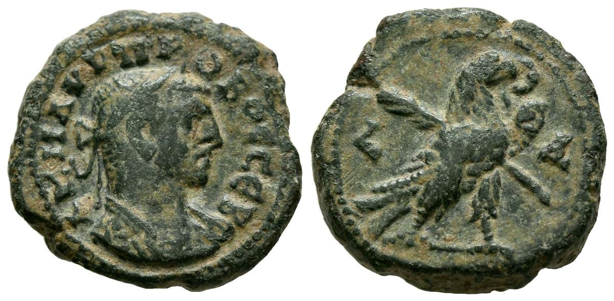CLAUDIO II. Tetradracma. (Ae. 7,05g/20mm). 269 d.C. Egipto, Alejandría. (Seaby 4743). Anv: Busto diademado y drapeado de Cladio II a derecha, alrededor leyenda. Rev: Aguila con corona de laurel, detrás palma, entre letras. MBC.