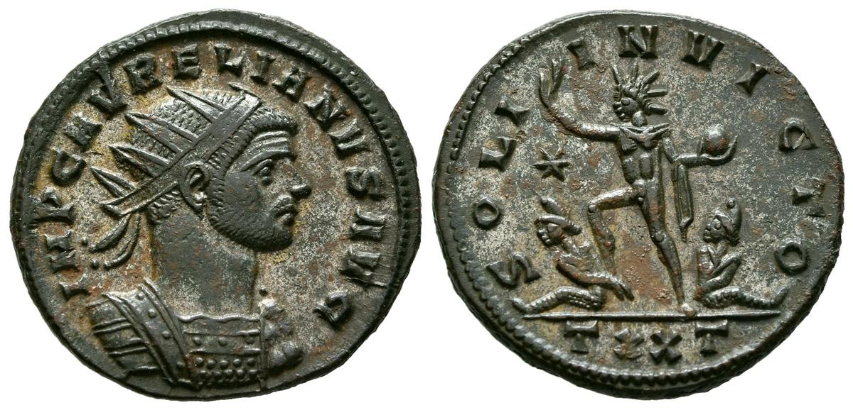 AURELIANO. Antoniniano. (Ae. 4,64g/22mm). 274 d.C. Ticinum. (RIC 151). Anv: Busto radiado y con coraza de Aureliano a derecha, alrededor leyenda: IMP C M AVRELIANVS AVG. Rev: Sol estante a izquierda portando globo, entre dos cautivo sentados, en campo estrella, en exergo: TXXT, alrededor leyenda: SOL INVICTO. EBC.
