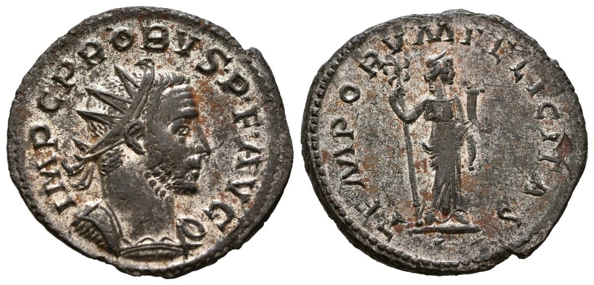 PROBO. Antoniniano. (Ae. 3,32g/22mm). 277 d.C. Lugdunum. (RIC 52). Anv: Busto radiado y con coraza de Probo a derecha, alrededor leyenda: IMP C PROBVS P F AVG. Rev: Felicitas estante a derecha portando cetro y cornucopia, en exergo: I, alrededor leyenda: TEMPORVM FELICITAS. EBC-. Restos de plateado original.