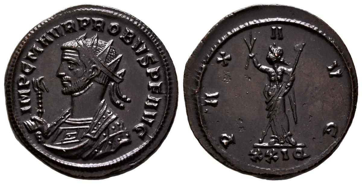PROBO. Antoniniano. (Ae. 3,91g/22mm). 277 d.C. Siscia. (RIC 704). Anv: Busto diademado y con coraza a derecha portando estandarte con águila, alrededor leyenda: IMP C M AVR PROBVS P F AVG. Rev: Pax estante a izquierda portando rama y cetro, en exergo: XXIQ, alrededor leyenda: PAX AVG. EBC. Bonito ejemplar.