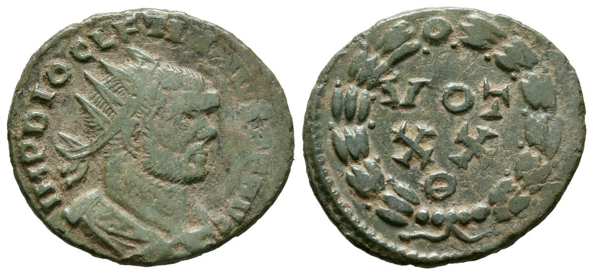 DIOCLECIANO. Antoniniano. (Ae. 2,97g/21mm). 296-297 d.C. Roma. (RIC 83). Anv: Busto radiado y drapeado de Diocleciano a derecha, alrededor leyenda: IMP DIOCLETIANVS P F AVG. Rev: Leyenda: VOT/XX/O dentro de láurea. MBC. Pátina verde.