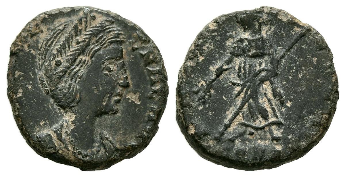 HELENA. Follis. (Ae. 1,60g/14mm). 330 d.C. Constantinopla. (RIC 33). Anv: Busto diademado y drapeado de Helena a derecha, alrededor leyenda: FL IVL HELENAE AVG. Rev: Pax estante a izquierda portando rama y cetro, en exergo: CONSE, alrededor leyenda: PAX PVBLICA. MBC.